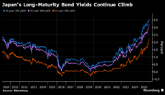 日本30年期国债收益率一度上升逾10个基点至3.59%,达到推出以来的最高水平,而10年期和20年期国债收益率均升至1999年以来的最高水平。