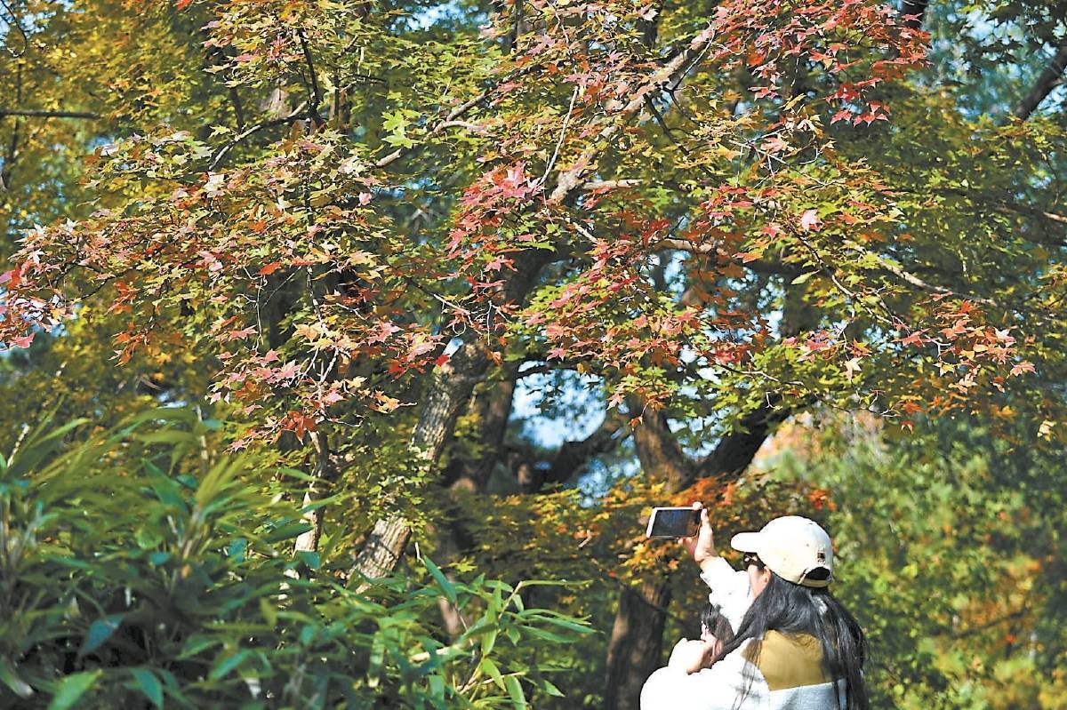 虽已是初冬,国家植物园里的秋色依旧浓郁。在园区东北侧的树木园中,高大的杂交鹅掌楸满树金黄,一片片叶子在秋风中随风摇曳。浓郁的秋色不仅挂在树上,还洒在地面上。在热带展览温室门前,金黄色的银杏叶铺满草坪,不少小朋友在上面快乐地奔跑、抛撒落叶。为了帮市民留住这份秋日限定浪漫,国家植物园对重点赏秋区域的落叶进行了缓扫处理,在保证安全的前提下,最大限度保留落叶自然铺陈的美感。