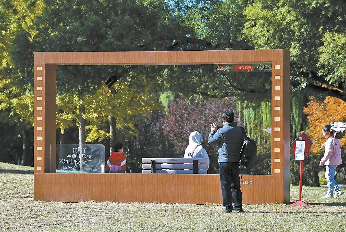 部分长椅旁设有可以互动的秋日主题邮筒,朝阳公园、地坛公园和清河之洲三大核心赏秋地还设置了大型电影相框,将秋日风光化作天然“摄影棚”。在朝阳公园万人广场,棕色的电影相框立在“网红树”前的草坪上,相框中央摆放着一把木质长椅,一旁的红色邮筒与之呼应,吸引不少新人来此拍摄婚纱照。“原本只是计划拍公园外景,没想到这个相框让照片有了电影海报的质感,太惊喜了!”一位新娘笑着说。